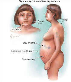Diyet ve Egzersize rağmen kilo veremeyen şişman kişilerin vücutlarında daha çok karın bölgesinde göğüs ve koltukaltlarında görülen kırmızı-mor renkli çatlaklar tansiyon yüksekliği, aydede yüzü tabir edilen özellikle yanak bölgesinde yağ dokusu artışı ve karın bölgesinde yağ dokusu artışı ile birlikteyse Cushing hastalığı olasılığı düşünülmeli ve gerekli laboratuar testleri yapılmalıdır.